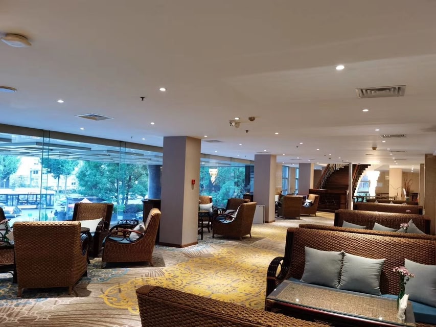 The Jinhe Hotel (Jinhe Binguan) is a modern hotel located in the center of Chengdu, facing People's Park and only a 10-minute walk from Tianfu Square, which features a Chairman Mao statue looming over the square with an elaborate water show synchronized to music, and Wide and Narrow Alley, a gentrified pedestrian street with many teahouses to relax in after a tiring morning of exploring Chengdu. As a result, the transportation is relatively convenient and you are right in the amalgam of dynamic modern culture and cultural history that permeates the area. The Jinhe Hotel is a luxury hotel for business travelers, with two banquet halls, 15 conference halls of varying sizes, multiple dining rooms, free high-speed broadband Internet access, satellite TV, a business center, a shopping center, beauty salon, teahouse and a large outdoor parking lot.